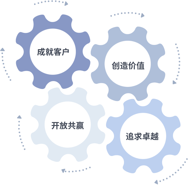 成就客户是一切决策的出发点,创造价值是衡量所有工作的标准,追求卓越是cy彩运网做事做人的态度,开放共赢是cy彩运网的格局也是最终的结果。价值观的齿轮环环相扣,推动着组织里的每个人不断向前。